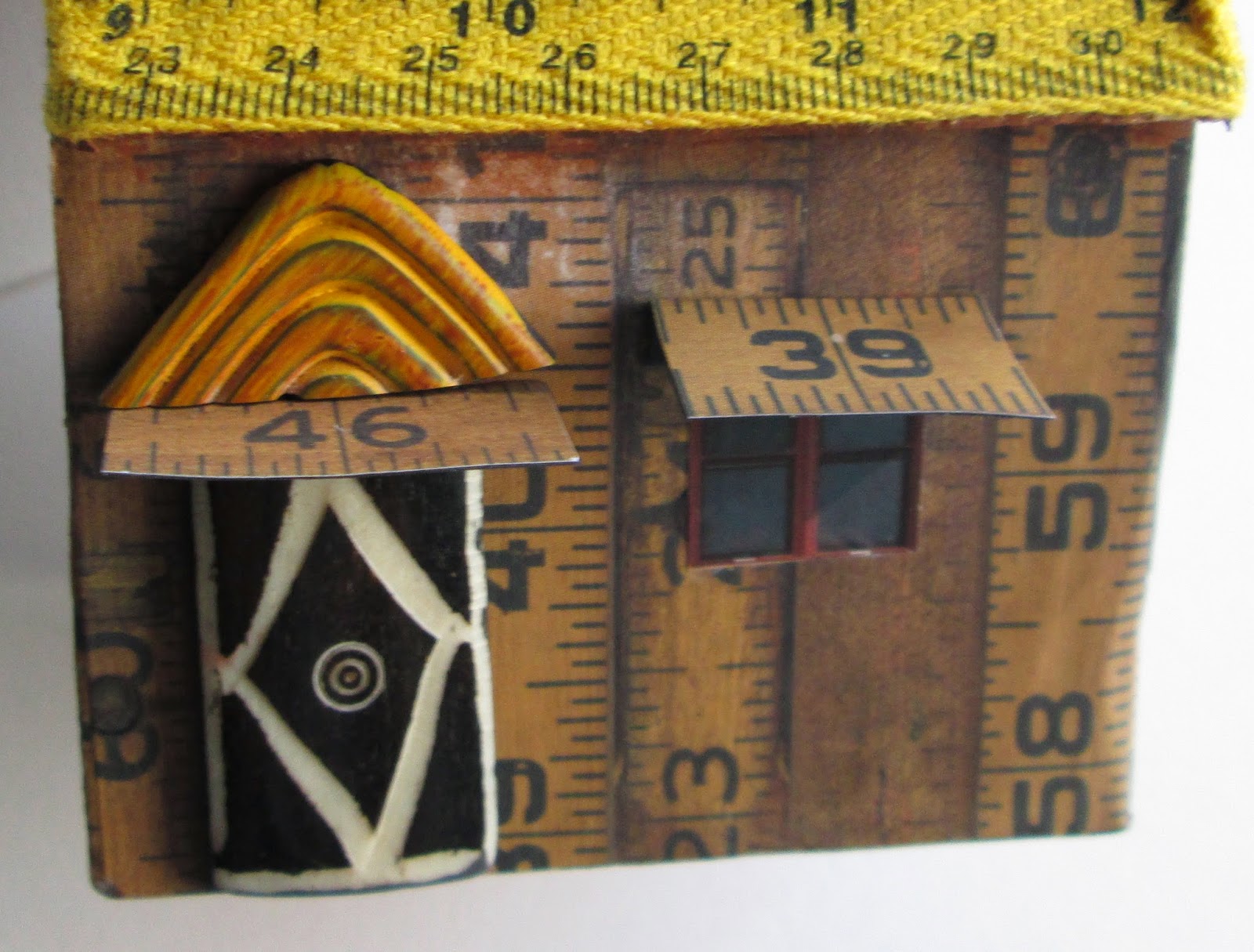 This year, my little house started with the idea that I wanted to "side" the house with paper that features old wooden rules. In my ribbon stash I had some yellow cotton ribbon that looks like the tapes in the metal retractable measuring tapes -- I wanted to use this for the gutters on the house. And, for a not-so-subtle play on words, I ended up naming this piece "House Rules."
